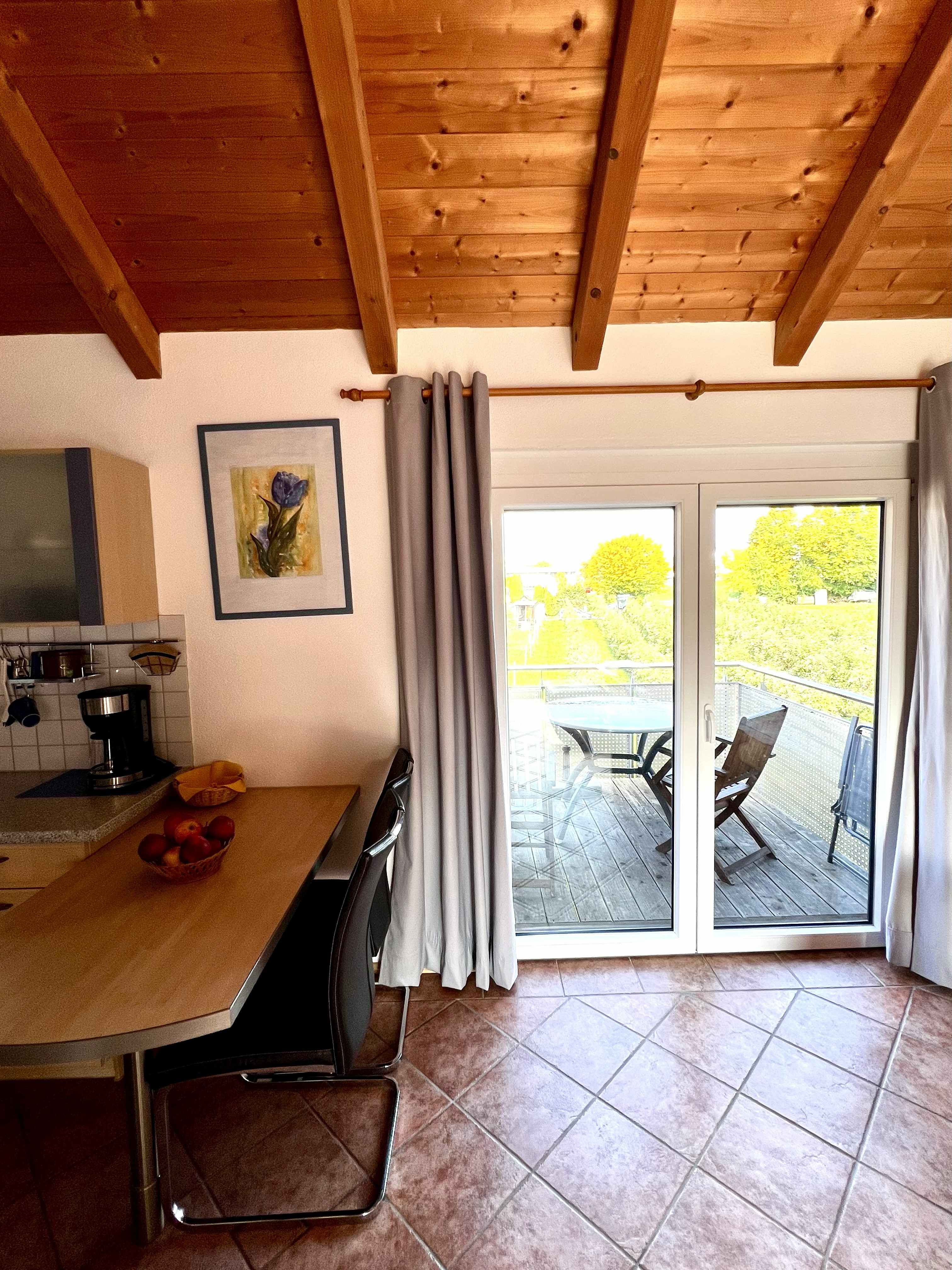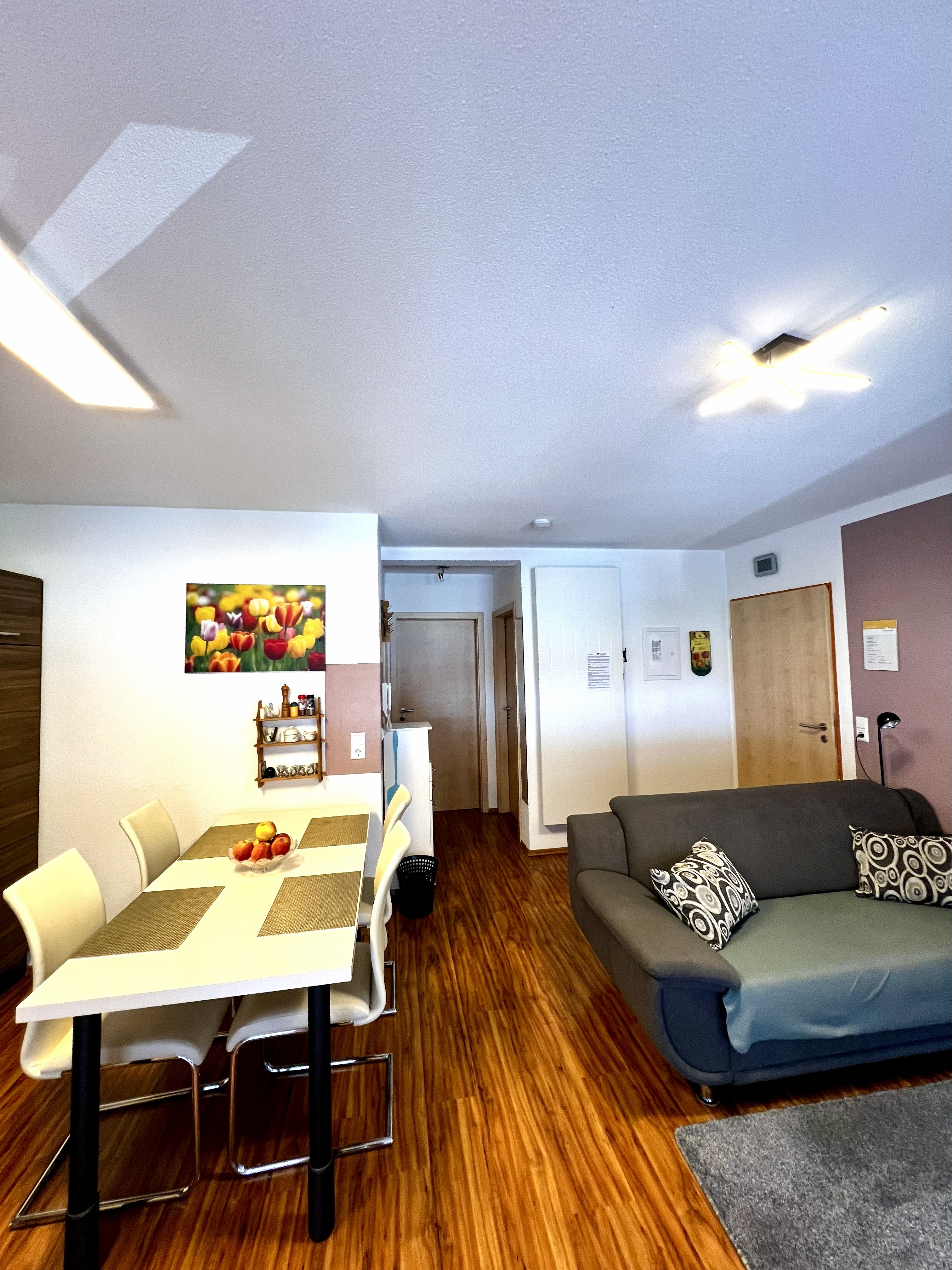 Bei der Ferienwohnung Birnenblüte handelt es sich um ein helles 1-Zimmer-Appartement mit ca. 40qm und zwei Balkonen für die Morgen- und Abendsonne.