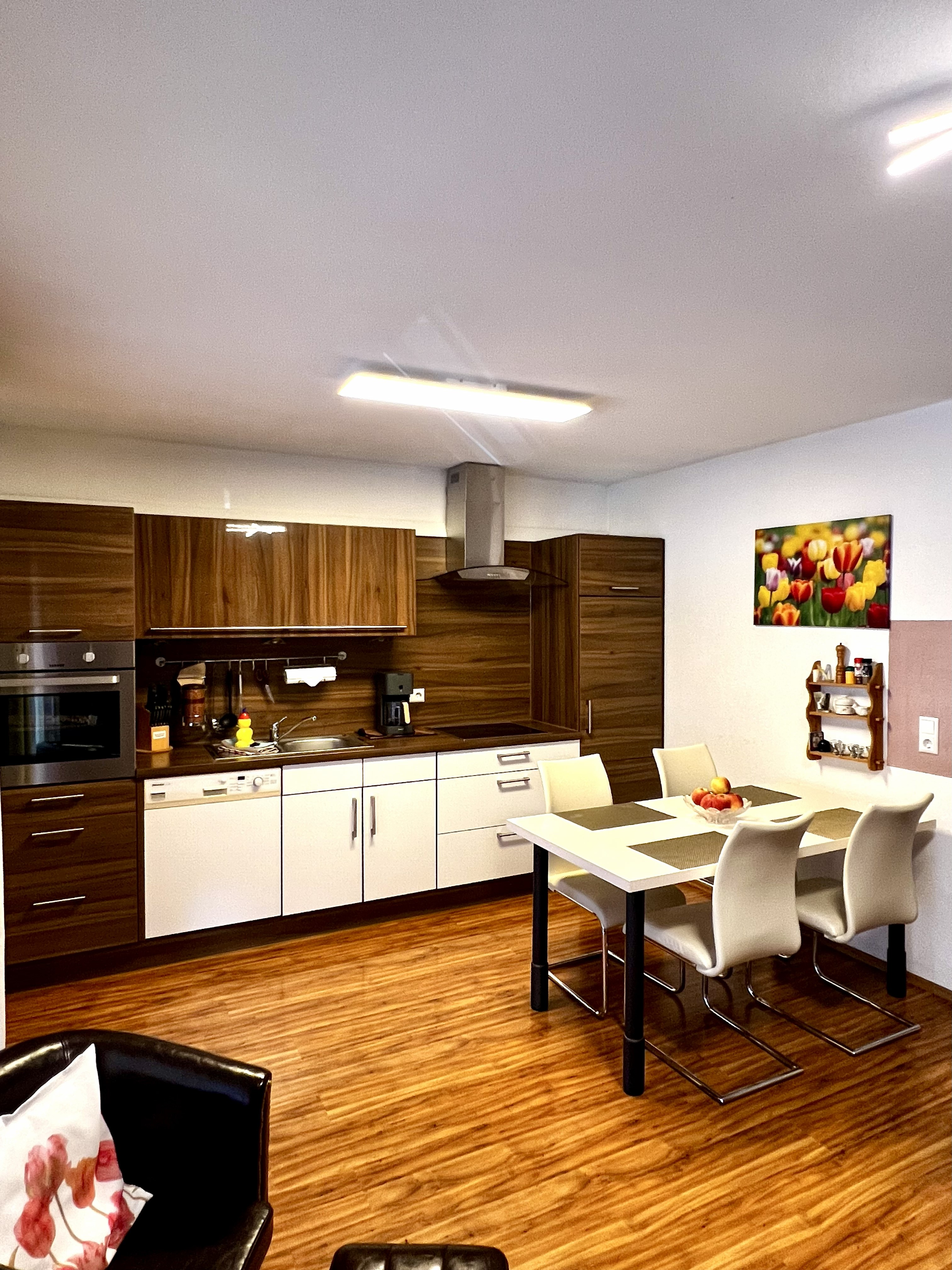 Das Appartement verfügt über eine komplett ausgestattete Einbauküche inkl. Spülmaschine, Toaster, Kaffeemaschine, Backofen, Wasserkocher, Kühl- und Gefrierschrank.